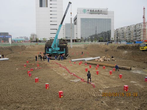 金融中心工程是十七冶在蚌三大BT项目之一,自3月28日破土动工以来,已施工完高压旋喷桩170根,钻孔灌注桩40根,A、B两栋25层写字楼基坑已挖至-5.2m,土方外运量达40000方。