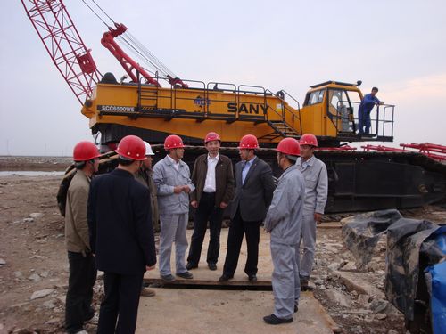 康董事长随后又来到施工现场,认真察看了风机的基础施工情况,并对现场的650t吊车吊装情况进行详细的了解。当看到一台台风机雄伟地矗立在滩涂上,康董事长非常高兴地说,风电事业大有前途,你们一定要把它做强做大。