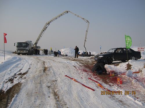 开工以来,由于蓬莱地区连降大雪,施工现场坡陡路滑,给施工带来极大困难,蓬莱项目部全体员工为了兑现对业主的承诺,攻坚克难,抢抓工期,施工按计划有序推进。元月一日早上9点15分,第一个风基基础的浇灌在11号风机基坑上准时浇灌,8辆混凝土搅拌车穿梭不停地将混凝土从