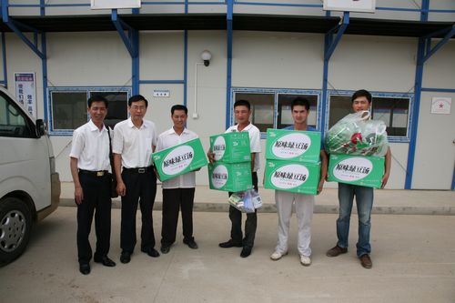 727,公司工会副主席杨绍凤一行受公司领导的委托,来到马钢动车组生产线、高山农民安置房、当涂五星佳苑安置房、开发区银塘组团安置房、乔山安置房等项目部,为基层员工们送上绿豆汤、茶叶、十滴水、人丹、清凉油、藿香正气水等防暑降温用品,送去公司领导对奋战在高温一线的广大员工诚挚的问候和深切的关怀。