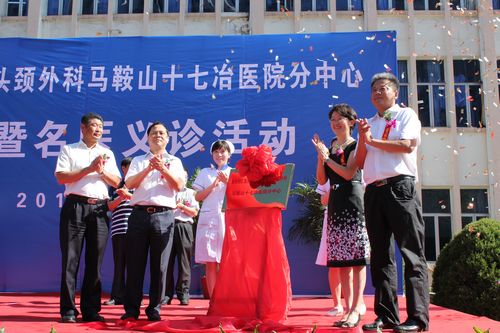 728上午,马鞍山十七冶医院门诊楼前热闹非凡。南京同仁医院眼科、耳鼻咽喉头颈外科十七冶医院分中心签约揭牌仪式暨名医义诊活动在这里隆重举行。马鞍山市副市长高晓平、中国十七冶集团总经理喻世功、南京市卫生局医政处处长李俭和南京同仁医院院长朱正宏共同为中心揭牌。