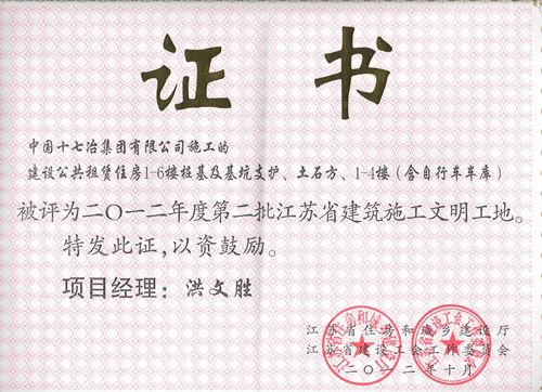 日前,由十七冶南京分公司承建的南京江宁保障房(公共租赁房)项目荣获江苏省建筑施工文明工地称号。