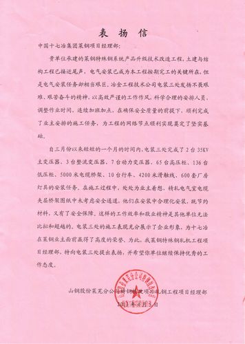 莱芜特钢技改项目轧钢工程项目部向我公司项目部致表扬信