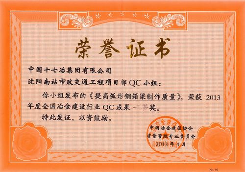 日前,在中国冶金建设协会组织召开的2013年度全国冶金建设行业质量管理小组成果评审交流会上,中国十七冶集团城建工程技术公司沈阳南站市政交通工程项目部QC小组发布的《提高弧形钢箱梁制作质量》荣获一等奖。