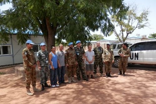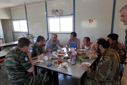 中午,埃瓦尔将军一行高兴地与项目员工一起在食堂就餐,兴致勃勃地品尝着中国菜,并向项目部赠送带有联合国标志的T恤作为纪念。