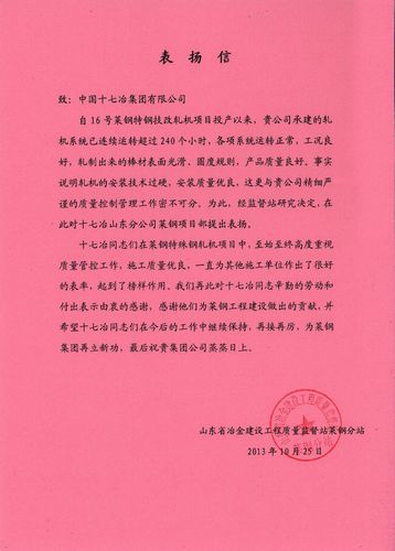 日前,山东省冶金建设工程质量监督站莱钢分站致信中国十七冶集团,表扬山东分公司莱钢项目部精细严谨的质量管控工作和山东分公司优质高效地为莱钢工程建设做出的贡献,并对此表示衷心的感谢。