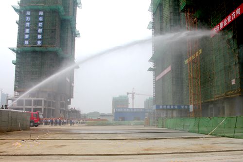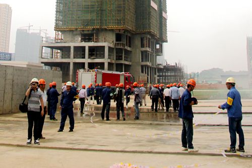 公司对此次应急救援演练事先做出了精心策划和细致安排。下午3时,总指挥、公司安监部部长做演练动员并发出演练开始指令。两名施工人员模拟报告在建施工的7#6层悬挑脚手架外安全防护立网起火火警,项目经理即刻启动突发事故应急处救援预案,现场迅速进入紧张而有序的应急救援氛围,抢险救援小组同时展开警戒隔离、人员疏散和干粉灭火器灭火。308分,现场高呼有人触电,救援人员立即以方木挑开电源线,关闭电闸,以担架转移触电人员并及时实施检查、包扎、抢救,救援车及时跟进载受伤人员到医院救治。