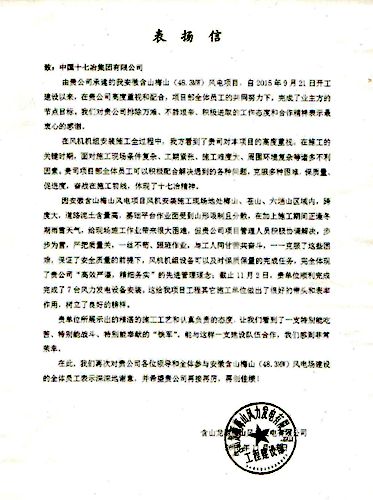 1119,含山龙源梅山风力发电有限公司工程建设部致信中国十七冶集团,对十七冶风力与太阳能发电工程技术公司在建设安徽含山梅山风电工程中排除万难、不辞艰苦、积极进取的工作态度和团结合作精神表示衷心感谢。