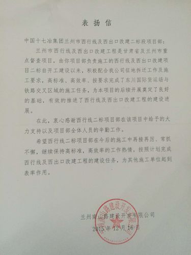 1219,中国十七冶集团路桥工程技术公司兰州市西行线及西出口改建项目部收到兰州南山路建设开发有限公司表扬信。业主对项目部积极配合开展征地拆迁工作,高标准、高效率、按要求完成东川国际货运场与铁路交叉区域的施工任务,表示衷心感谢。