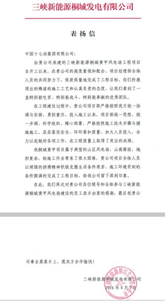 48上午,三峡新能源桐城发电有限公司向中国十七冶集团发来表扬信,表扬公司在桐城黄甲风电场施工中认真负责,积极与业主配合,展现出精湛的施工工艺,保质保量完成工程目标所做出的贡献。