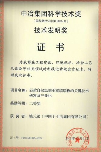 日前,从中冶集团科技部获悉,十七冶工程科技公司《轻质自保温非承重墙墙板的关键技术研发及产业化》项目荣获2015年中冶集团科学技术发明二等奖,该项目授权发明专利7项,认定省级高新技术产品5项。