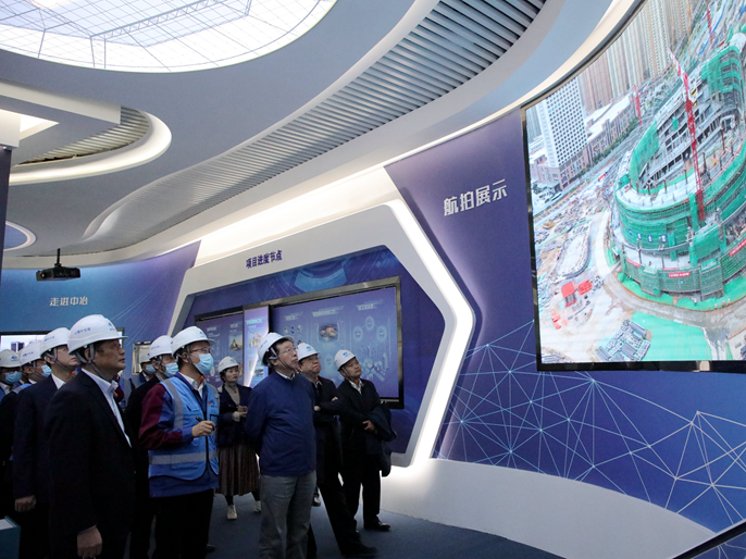 在项目现场,周纪昌、余海龙董事一行首先参观了兰州奥体科技展示馆、兰州奥体效果图和航拍展示,全面了解了智慧化管控平台运行和BIM+5G技术应用情况以及一场三馆及运动员公寓的功能及意义。在施工现场,两位董事查看了项目施工情况,听取了项目负责人对进度、安全、质量、新技术应用等方面情况的汇报,并在现场召开了调研座谈会。