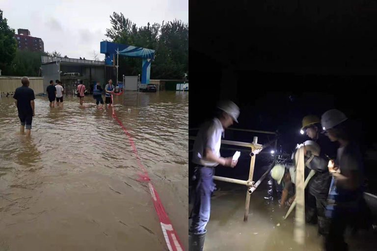 在大河社区安置房项目,现场车库积水达两米,C地块基坑积水约两米,基坑坍塌近20米,项目部立即组织疏散100余名作业人员,组织挖机、铲车对坍塌区域进行抢险,并采购近3000元物资用于抢险保障。在郑州财经学院,现场一、二组团基坑内局部积水40厘米,基坑上口冲刷流失较严重,圈地围墙有四处倒塌,临时道路有局部基础冲刷流失,项目部立即禁止非相关人员进入现场,关闭施工机械及垂直运输设备电源,对积水区域进行抽水作业,并储备了抗洪抢险物资,以及编织袋、照明设备等以备急用,充分做好防汛抢险准备工作。