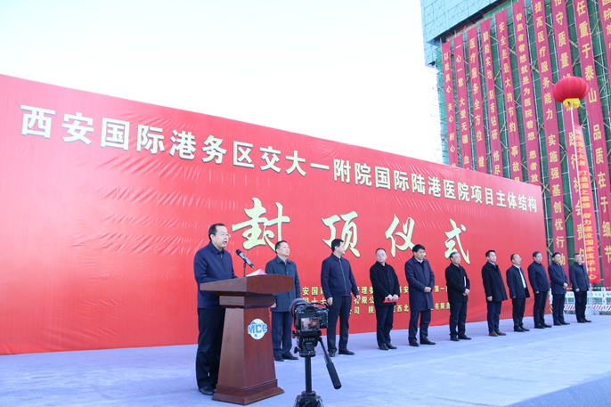 11月30日上午,中国十七冶集团陕西分公司承建的西安交通大学第一附属医院国际陆港医院项目主体结构封顶。西安交通大学副校长颜虹,陕西省卫健委一级调研员于春富,西安国际港务区党工委书记、管委会主任孙艺民,西安市卫健委副主任荣亮,西安交通大学校长助理,第一附属医院院长、党委副书记吕毅,医院党委书记马辛格、副院长王茂德,西安国际港务区党工委副书记苗吉、副主任任社,西安市卫生健康委员会规划信息处处长于涛,中国十七冶集团总工程师、副总经理尹万云等出席封顶仪式。
