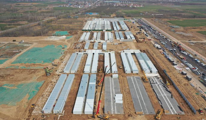 建筑分公司正加快推进山东惠民县防疫设施,7台大小挖机,220余名施工人员正在紧张作业中。截至23日,A、B区隔离间已交付使用,C、F、G区板房安装完成,H区板房安装完成95%,水电管线和卫生洁具全部安装完成。