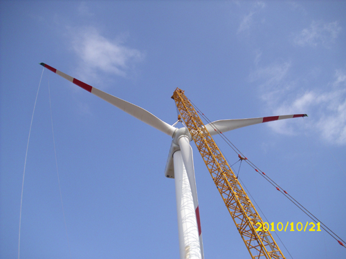该试验机由太原重工股份有限公司投资兴建,位于山西省神池县大泉洼村风电场,风机叶片长42.2m,机舱总重达86t1017日开始吊装,比业主规定的工期提前两天完成安装任务,赢得了业主的赞誉。