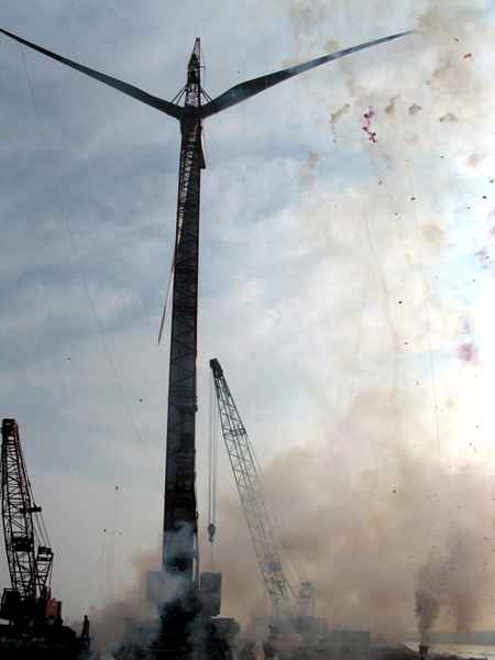 620,江苏灌云风电项目施工现场彩旗飘扬,机器轰鸣,1658分,当最后一台风机的叶轮与机舱成功对接后,震耳的鞭炮响起来,五彩的礼花冲向了蓝天,至此,由风电公司承建的灌云风电项目36台风机的吊装工程全部结束,为安装工程大节点划上圆满句号。