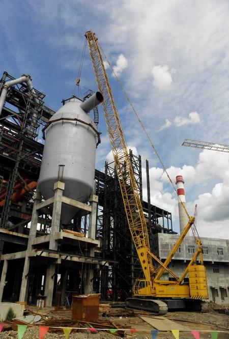 6月中旬,400吨吊车一进场,项目部就立即组织精兵强将将大吊车组装好,迅速投入到一号转运站主皮带机通廊的吊装之中,九天中连续吊装就位二号、三号、四号支架,三号、四号五号通廊。与此同时,腾出260吨吊车,顺利完成了重力除尘器的吊装。在此期间,作为高炉系统的主攻单位——机电公司机装二处,继二十六组风口大套焊接一次性通过无损检测之后,集中力量安装炉顶设备,为九十八米炉顶框架和风管的吊装做准备。机电公司管道一处主动和业主联系,对冷却壁管道实施打压检测,为筑炉工程铺平了道路;筑炉工程经过业主对捣打材料的反复检测,目前已全面展开。一号高炉系统从矿槽道铸铁机,共有电缆和导线450多公里,三个电气作业处在项目部的协调下,正有序地开展铺设工作,全力以赴为7818日高炉主控楼高、低压受电做努力。二号高炉基础,经过五昼夜地连续作业,近三千立方的混凝土浇筑完工。目前,吉钢工程的各项工作正有条不紊地向前推进。