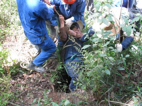 上午1030分左右,两名当地的老妪慌慌张张跑到我公司池州海螺三期项目部求救,称她们在附近的山上采茶时,63岁的同伴王某掉入半山腰的洞穴中。容不得多想,正好在办公室的项目部副经理施阳光、质安部长苏元玉等8名同志,一边报警,一边立即组织营救。由于求救老人高度紧张,已记不清出事的具体方位。多一分钟的耽搁就多一份危险,参加营救的人员当即决定成“一”字型向山顶搜救。在离山顶10余米处的一个直径约0.7、深8多的深坑中终于发现了王某的踪迹。在和洞中的王某联系后,营救人员一面对她进行心理疏导,一面指导她如何配合营救。经过四十多分钟紧张有序的营救,老人成功获救。看到同伴平安无事,原本精神高度紧张的老人们抱在一起激动地哭了起来。当池州警方赶到出事地点后,看到出事农妇已被成功营救上来时,被此情此景深深的感动了。他们对十七冶员工在如此短暂的时间内,有条不紊的成功营救表示赞赏:“不愧为十七冶人,你们不仅为池州的重点工程作出了贡献,也尽显出央企员工高尚的道德情操,谢谢你们!谢谢你们!”