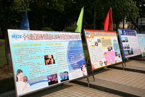 在金家庄区幸福广场的人行道上,摆放着十七冶等单位制作的70块宣传展板,五色彩旗迎风飘扬,来往群众驻足观看。
