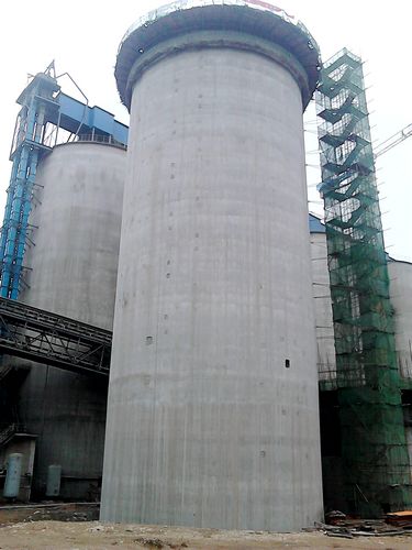 该水泥储存及输送子项共有5个体型相同的水泥库,直径18.0,高度45.0,库底板厚1.5,内有减压锥体。此子项自106开工以来,项目部充分发扬艰苦奋斗的精神,克服了开工时间晚、施工任务艰巨等困难,1#库顺利滑模到顶,2#库也已滑模施工至20.0
