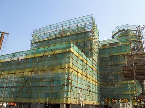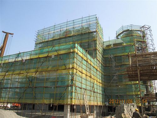 金浩•仁和天地一期工程总建筑面积125101.32m2,地库总面积25000m2,包括9栋高层住宅和1座售楼部。售楼部为框架结构三层,局部六层,主厅高度8.4m,斜屋面顶坡度近60度,造型复杂。按照业主售楼部必须在117日交付装修的要求,项目部全体员工发扬了“高效严谨、精细务实”的企业作风,科学组织施工,从911日土方开挖到结构封顶,只用了不到两个月的时间。