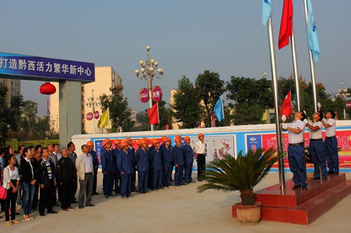 108上午,城建工程技术公司贵州花开城项目部举行的升国旗仪式,项目团队集体面向国旗庄严宣誓:秉承“敬业 忠诚 团结  进取”企业精神,建好花开城工程,服务黔西县社会发展。