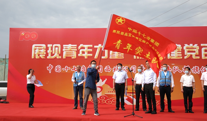 在项目授旗仪式会场,甘肃、建筑、公路分公司纪委书记、工会主席向青年突击队授旗,各项目部青年突击队队长带领队员庄严宣誓并宣读倡议书,表示要不断提高思想认识,牢固树立红线意识和底线思维,始终保持蓬勃朝气、昂扬锐气,以高度的责任感和使命感奋战在自己的工作岗位上,在急难险重任务面前,充分发挥青年队员在生产建设中的主力军作用,全面完成施工生产任务,为建党一百周年奉献青春力量