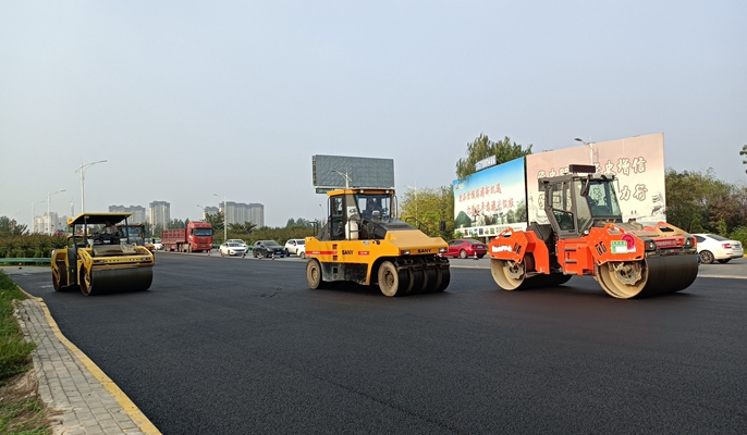本次沥青摊铺采用双机作业,共动用6台压路机开展碾压作业,全面推进施工进度。开工前,项目部认真筹划、精心组织、合理调配机械设备和作业人员,自9月7日开始拆除立交桥西半部路段既有人行道、路面铣刨,至9月10日晚,仅用4天便完成了沥青下面层摊铺,取得了项目建设的阶段性成果,保障了各项工作的平稳有序推进。