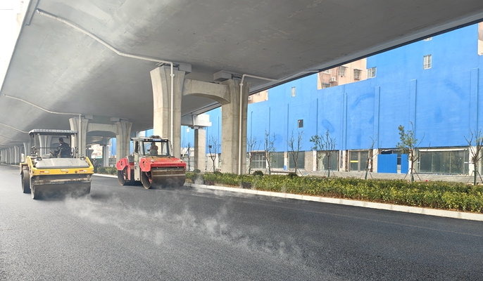 S234鸭河至南阳快速通道分卧龙段、鸭河段、城区段三段建设,其中城区段(非涉铁段)项目总长约2.38公里(其中桥梁段长1.643公里),设计时速60公里,双向六车道规模,建成后将有助于发挥南阳城市功能和辐射引领作用,对促进南阳市组团式发展和一体化发展格局形成具有重要意义。此次U13-U14联地面辅道沥青摊铺面积约7032平方米,摊铺厚度为8厘米AC-25C沥青砼+4厘米AC-13C改性沥青砼,采用两台摊铺机梯队式摊铺,一台胶轮压路机配合两台钢轮压路机进行组合碾压作业。