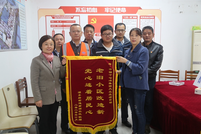 10月20日上午,马鞍山市湖东路第四小学校长裴筠及湖东路街道南湖社区委员会代表分别将两面印有“技术精良服务至上 造福小区美誉四方”“老旧小区改造新 党心连着聚民心”锦旗送到马鞍山大北庄老旧小区整治改造项目部,对十七冶团队为民办实事、解民忧表示感谢。