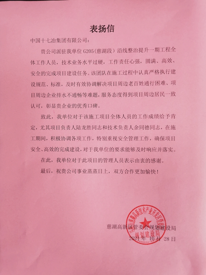 10月28日,马鞍山慈湖高新区管委会规划建设局向中国十七冶集团致表扬信,对十七冶项目团队在G205(慈湖段)沿线整治提升一期工程中所作出的努力和贡献表示感谢。