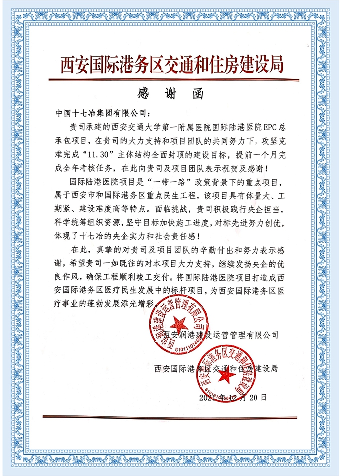12月20日,西安润港建设运营管理有限公司、西安国际港务区交通和住房建设局致信感谢中国十七冶集团,高度赞扬了陕西分公司在西安交通大学第一附属医院国际陆港医院项目建设中,提前一个月完成全年考核任务。