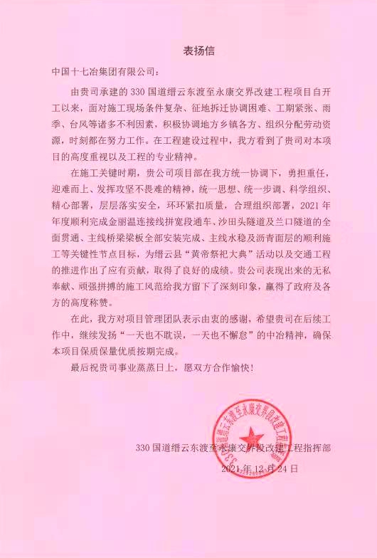 12月24日,330国道缙云东渡至永康交界段改建工程指挥部向中国十七冶集团致表扬信,对中国十七冶集团路桥工程技术分公司330国道缙云东渡至永康交界段改建工程项目部克服诸多不利因素、积极推进工程进度提出表扬并表示感谢。