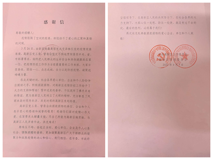 4月11日,安徽淮南高新区党工委和管委会向中国十七冶集团致感谢信,对中冶置业(安徽)公司安理家园项目部在克服自身防疫物资紧张等实际困难情况下,积极主动向项目所在地管委会捐赠防疫物资,给予表扬并感谢。