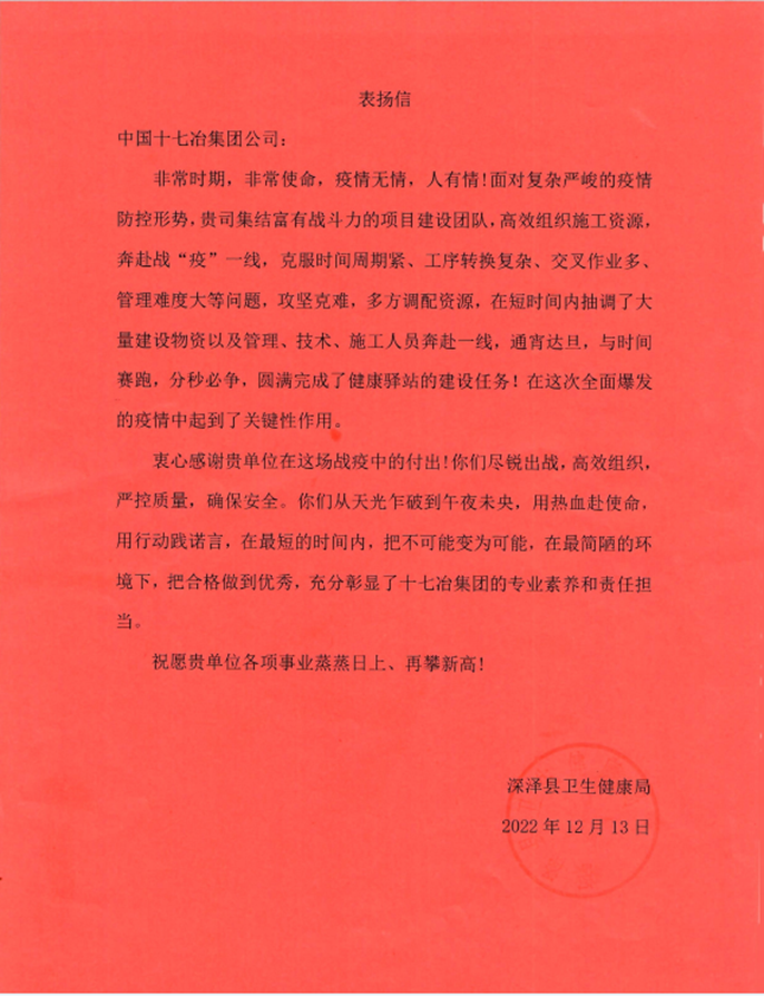 表扬信中指出,面对复杂严峻的疫情防控形势,中国十七冶集结富有战斗力的项目建设团队,高效组织施工资源,奔赴战“疫”一线,克服时间周期紧、工序转换复杂、交叉作业多、管理难度大等问题,在短时间内抽调了大量建设物资以及管理、技术、施工人员奔赴一线,圆满完成健康驿站的建设任务,在本次全面爆发的疫情中起到了关键性作用。中国十七冶集团在这场战疫中尽锐出战,高效组织,严控质量,确保安全,从天光乍破到午夜未央,用热血赴使命,用行动践诺言,在最短的时间内,把不可能变成可能,在最简陋的环境下,把合格做到优秀,充分彰显了十七冶集团的专业素养和责任担当。
