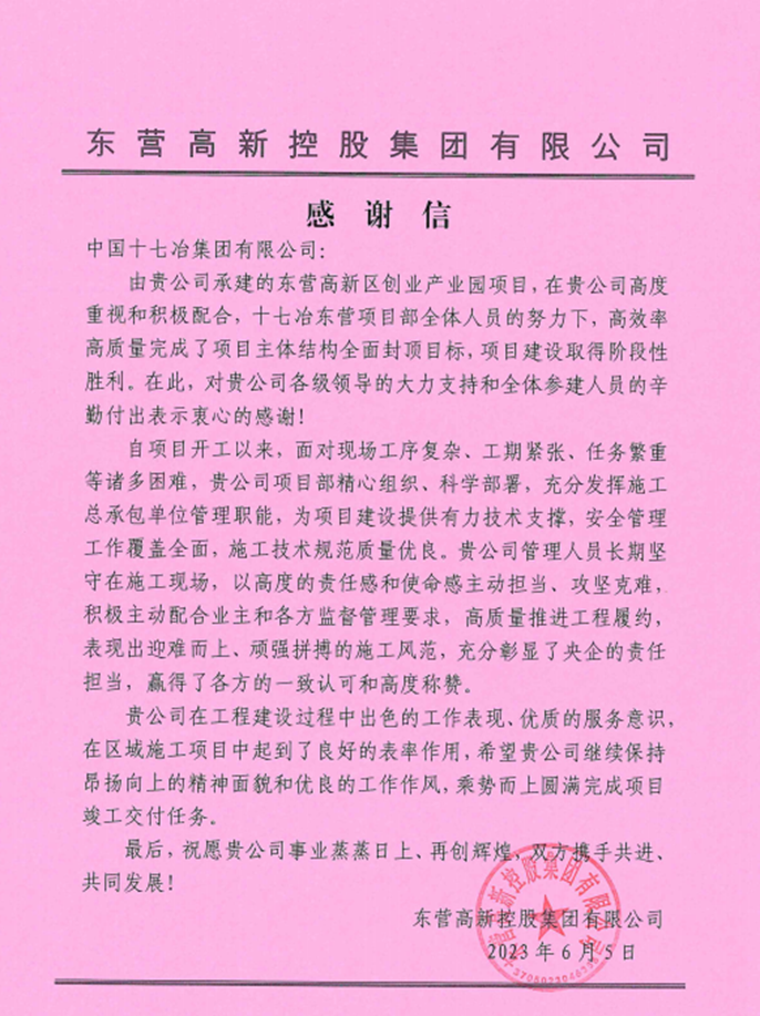 6月5日,东营高新控股集团有限公司向中国十七冶致感谢信,向山东分公司东营高新区创业产业园项目团队高效率、高质量完成项目主体结构全面封顶目标表示衷心感谢。