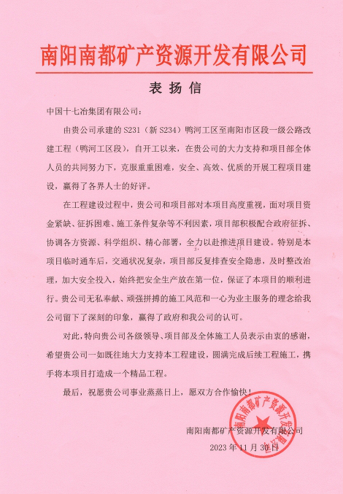 11月30日,南阳南都矿产资源开发有限公司向中国十七冶集团致表扬信,对路桥分公司S231(新S234)鸭河工区至南阳市区段公路(鸭河工区段)项目团队安全、高效、优质推进项目建设提出表扬。