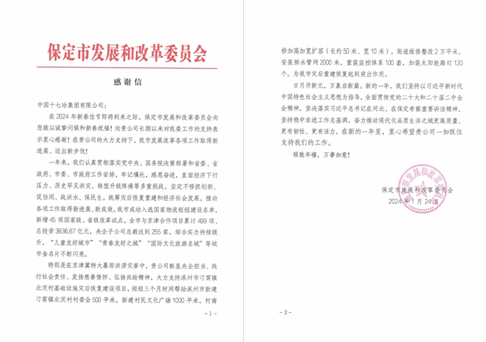 1月24日,保定市发展和改革委员会向中国十七冶集团有限公司致感谢信,对十七冶长期以来对保定市发展建设作出的贡献表示衷心感谢。