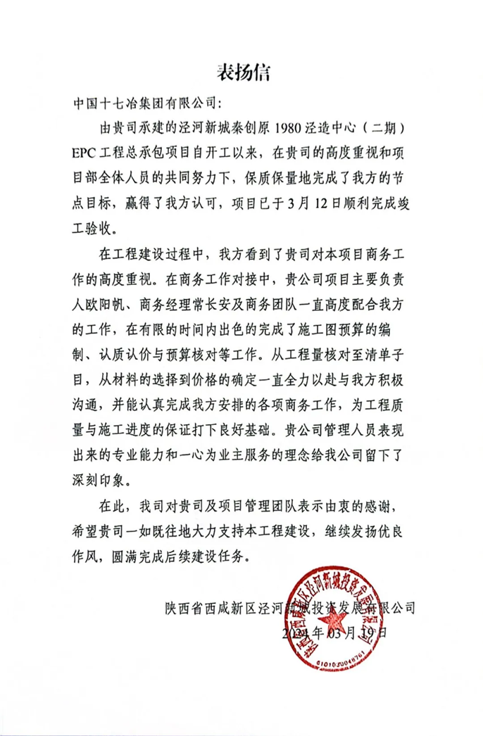 3月19日,陕西省西咸新区泾河新城投资发展有限公司向中国十七冶集团致表扬信,对陕西分公司秦创原1980泾造中心(二期)项目团队于3月12日顺利完成竣工交付目标表示衷心感谢。
