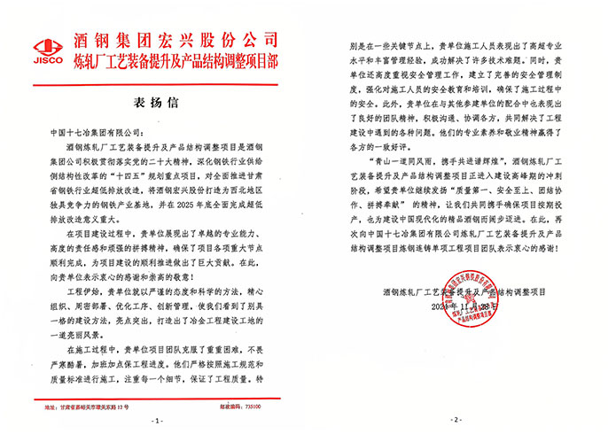 11月28日,酒钢集团宏兴股份有限公司向中国十七冶集团致表扬信,对冶金分公司项目团队在酒钢炼轧厂工艺装备提升及产品结构调整项目新炼钢工程建设中圆满完成各项重大节点表示感谢。