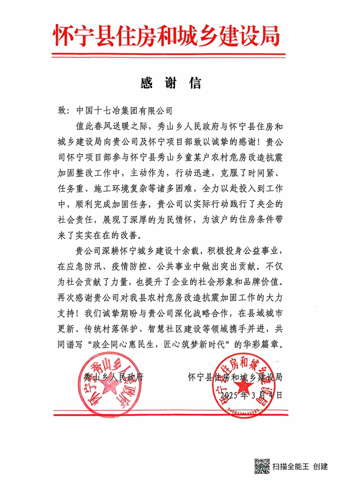 信中表示,十七冶项目部在秀山乡某户农村危房改造与抗震加固整改工作中,主动作为,行动迅速,克服了时间紧、任务重、施工环境复杂等诸多困难,以实际行动践行了央企的社会责任,展现了深厚的为民情怀,为该户的住房条件带来了实实在在的改善。此外,十七冶深耕怀宁城乡建设十余载,积极投身公益事业,在应急防汛、疫情防控、公共事业中做出突出贡献,为社会发展贡献了力量。