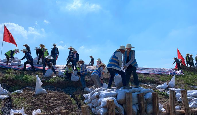 三伏天火辣辣的太阳蒸腾着大堤,热浪滚滚,即使不走动,在堤上站上几分钟,也会汗流浃背。抢险突击队员们在38℃高温闷热的环境下,挥汗如雨,拿起编织袋、铁秋,装砂石的装砂石,运沙袋的运沙袋,齐心协力,众志成城抗击洪水,和水位比高度,与洪峰比速度,不断加高加固圩堤。现场累计装运8200袋石子,堤坝加高30公分,加长300米,有效抵御了高水位的浸泡强压,防止堤坝塌方,得到政府部门的一致好评。