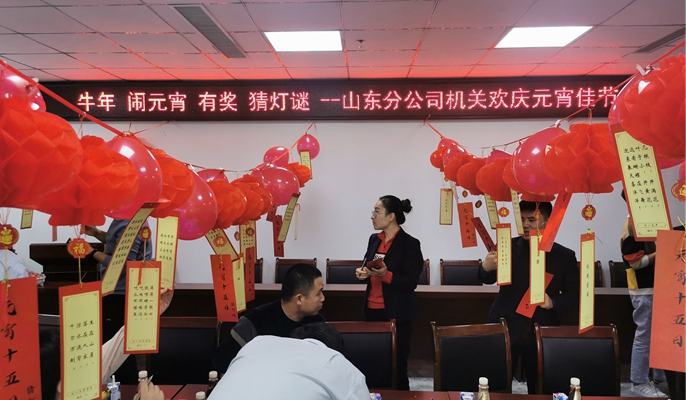山东分公司机关活动分为猜灯谜、才艺表演和趣味游戏三个环节。活动现场悬挂了一串串火红的灯笼和一百多条各类各样妙趣横生的谜语,大家踊跃参与到活动中,在一条条谜语彩带之间穿梭。有的驻足凝神,若有所思;有的猜中谜底,喜笑颜开;有的互帮互助,恍然大悟。耳畔萦绕着欢声笑语,活动现场充满了欢乐喜庆、温馨祥和的节日气氛。山东分公司青岛地区项目部党支部为节日期间坚守岗位的员工们准备了丰富精彩的活动,山东分公司党委书记邢飞与大家一起挂灯笼、猜灯谜、煮元宵、做游戏,营造了浓烈的节日氛围。