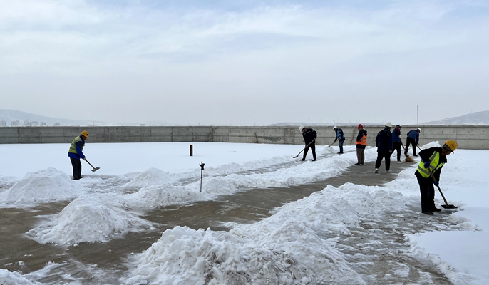 当天,项目部全体管理人员与作业人员共计50余人,对项目内主要道路、办公区、生活区、地库顶面及停车楼屋面等约1万平方米的区域的积雪进行清理。在扫雪除冰的过程中,全体人员精神饱满,干劲十足,相互配合,分工有序,与寒风搏斗,与积雪抗震,经过近一天的努力,施工现场主要道路及区域积雪全部清理干净,恢复屋面施工条件。