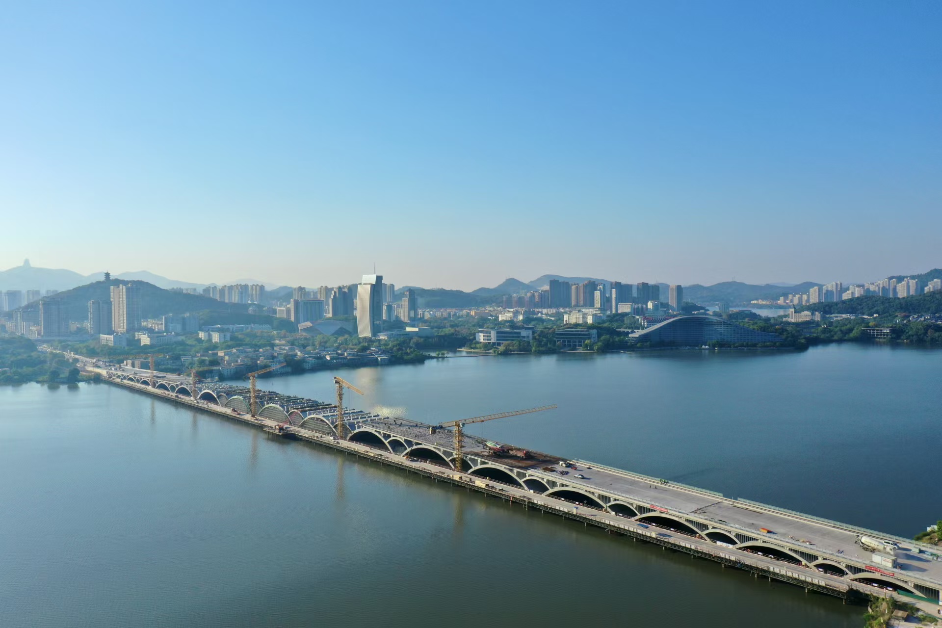 磁湖绿色廊道工程西起桂林南路—苏州路交叉口东侧,止于沿湖路—磁湖通道交叉口西侧,全长约1.5公里,规划在磁湖南侧修建磁湖大桥。磁湖大桥长846米、宽30.6米,双向4车道,以17孔葵花型拱桥姿态横跨磁湖。贯通后,将打通“沿湖路-磁湖大桥-苏州路”,形成一条与杭州路平行的东西向贯通性道路,实现团城山和磁湖南片区直接快速联系,有效引导磁湖南区土地开发和产业发展。